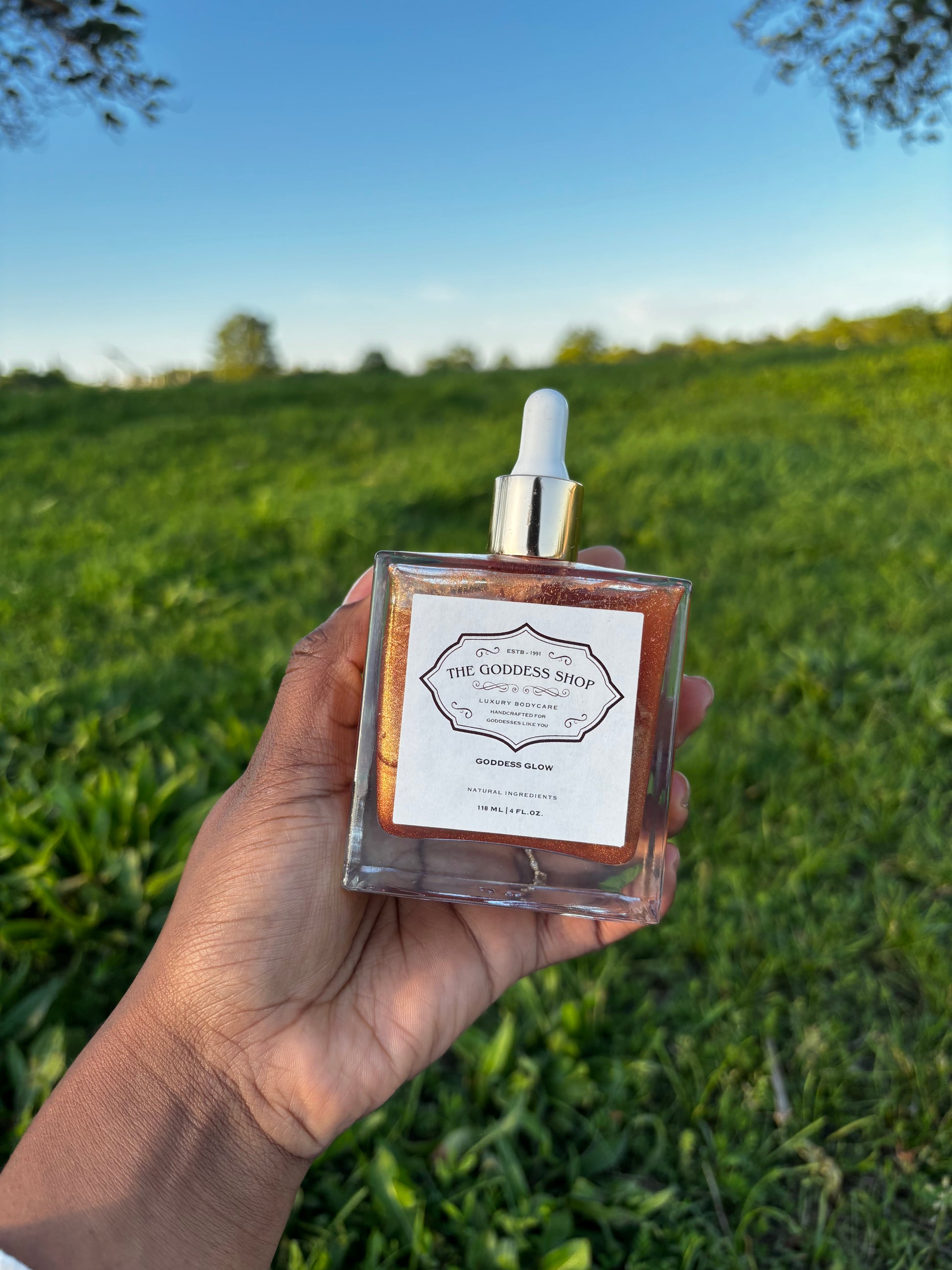 Unleash your inner goddess with Goddess Glow's Shimmer Body Oil. Experience a radiant, glowing complexion that will make you stand out like the sun. Say goodbye to dull skin and hello to a stunning, goddess-like radiance. Perfect for days (and nights!) when you want to shine bright.